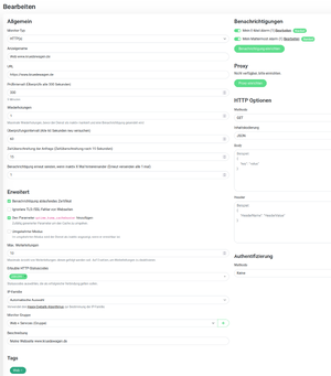 - Dienste-Checks wie HTTPS (inkl. Validierung der Gültigkeit von TLS-Zertifikaten, mit Pattern bzw. Status Codes - auch invers), DNS, TCP-Ports, Ping, SNMP, Datenbanken, Docker-Container, etc.
